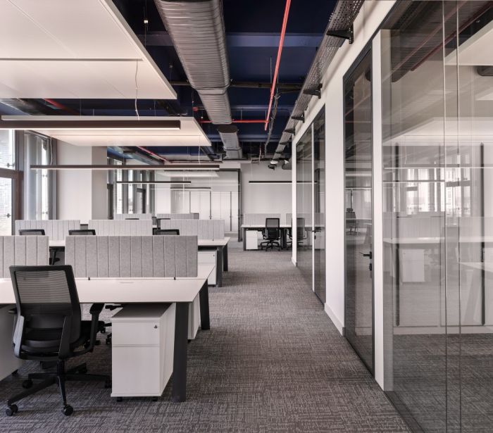 在該項目中,人力行政部門位于一樓;技術部門位于二、三樓。會議室和休閑區也根據需要布置在每一層。整體空間的白色調用于營造寬敞的氛圍。天花板被漆成深藍色,同時使用灰色調的技術設備,提供統一性。會議室和行政室的家具、柜臺以及儲藏室均采用定制,而開放式工作區則采用標準辦公家具。