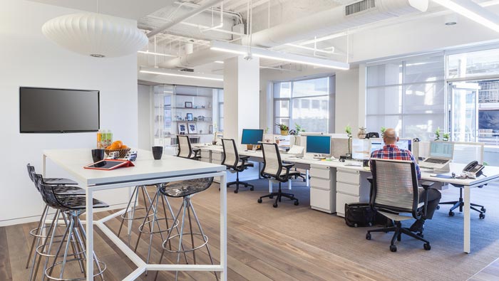 辦公區域的設計:設計師在設計的時候,將空間的柱子抱在辦工桌之內,這樣設計的好處就是化不利為有利,將柱子的弊端有效的加以規避,在設計師看來設計本身就是對空間的缺點加以彌補,一點小小的創意改變了此處的屬性,辦公桌團結在柱子四周有團結一體的正向象征。