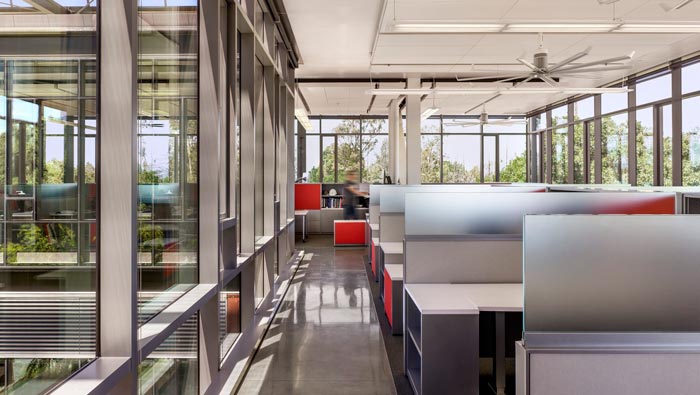辦公區(qū)域的設(shè)計:通過上圖可以看出此處空間,是一個半開放、半封閉的辦公空間,設(shè)計師這樣設(shè)計的目的就是希望,給每一個員工留下足夠的私人空間,辦公區(qū)域四周都是透明窗戶,這樣可以保證陽光可以時時照入室內(nèi),墻沿處設(shè)計師采用了進(jìn)門的折疊遮光板,將強光變?yōu)槿峁饨o每一個人溫暖的感受。