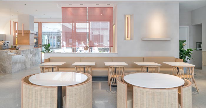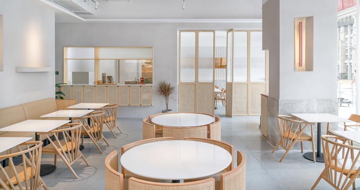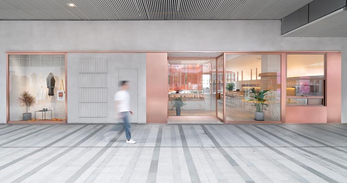 本次為茶餐廳設計項目,茶餐廳位于一個商業綜合體的室外一層,設計師希望創建一個舒緩的流線,引導人進入到一個愜意的氛圍空間。