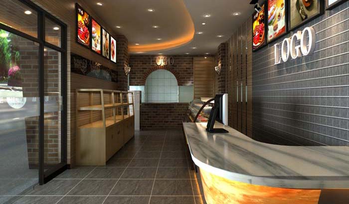 在蛋糕店裝修設計的時候,設計師主要采用咖啡色作為主色調,咖啡色,屬于中性暖色色調,它優雅、樸素、莊重而不失雅致,是一種比較含蓄的顏色,加上白色的logo,更加的突出品牌的展現和效果。