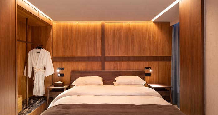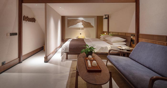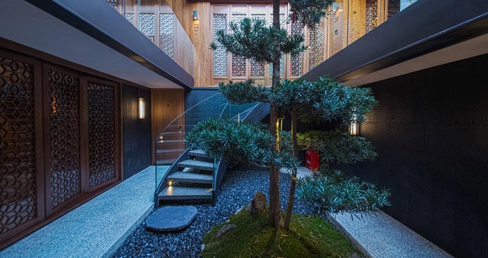 本次民宅民宿設(shè)計項目介紹結(jié)束,在設(shè)計中保留原建筑的柱網(wǎng)空間,同時以院落為中心,將空間劃分為四個客房區(qū)域,整體呈現(xiàn)中軸對稱的格局。