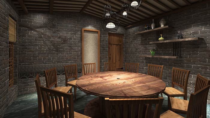 特色燒烤店餐區設計:這里給人的第一感覺就是安逸,這里所說的安逸是心靈的安逸,在這里沒有了時間的概念,設計師希望讓客戶在這里體驗日出而作、日落而息的美好生活。