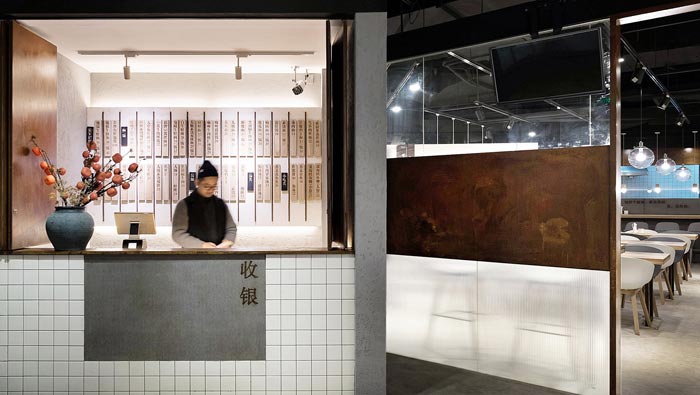 牛蛙面館入口裝修設(shè)計:設(shè)計師將面館入口處,布置成為收銀臺和等候區(qū),設(shè)計師為了保證空間的通透,與就餐不被打擾,故此采用三種不同透明度的材料,打造一個與眾不同的門。