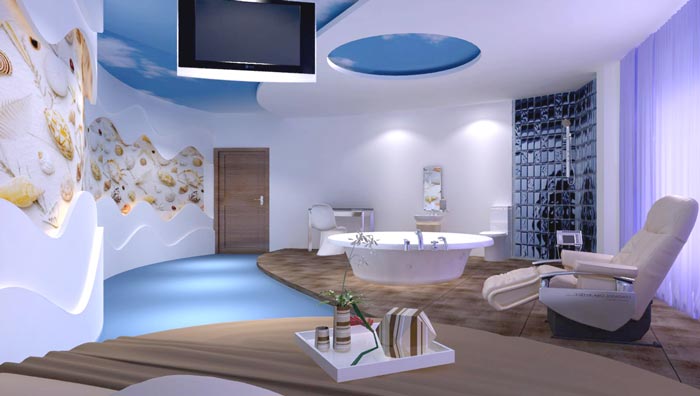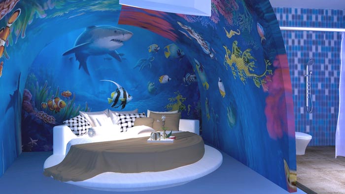 海底客房的設(shè)計(jì):在此次戀人們仿佛變成了無憂無慮的魚兒,去探險(xiǎn)那未知的海底世界,在這里他們會(huì)見到千奇百怪的海底生物,設(shè)計(jì)師希望讓他們,在這里來一次十分有意義的旅行,以此填補(bǔ)人們對(duì)于海底世界的無知,給戀人們一個(gè)美好的旅行,屬于兩個(gè)人之間的秘密。