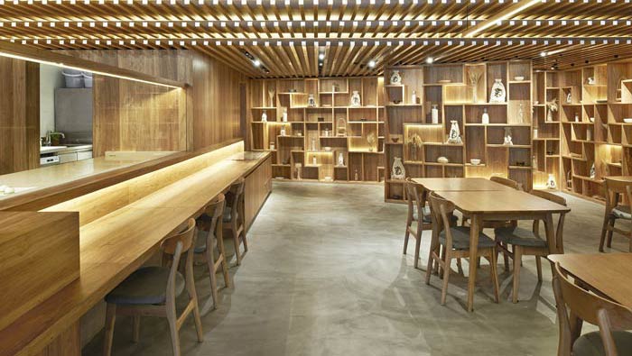 日式餐廳吧臺設(shè)計:吧臺可以清晰的看到廚師的一舉一動,從這一點也可以看出餐廳的信心,廚師從開始做到端上來,每一個細節(jié)都躲不過客戶的眼睛,讓客戶參與其中。