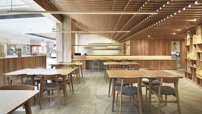 日式餐廳餐區(qū)設(shè)計:從側(cè)角看整個空間呈不規(guī)則分布,客戶在就餐區(qū)可以清晰的看到每一個區(qū)域,這樣設(shè)計是為了讓客戶吃的放心、吃的安心。
