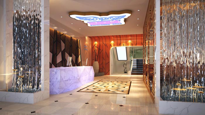 前臺的設計:在酒店的整體造型上面,設計師大致尊崇的是向內收縮的設計格局,設計師在設計中通過對酒店客房的估算,以此估算出一天的最高人流量,然后流出預估的空間,即滿足了需求,同時在空間的設計上面也可以做到量力而行。