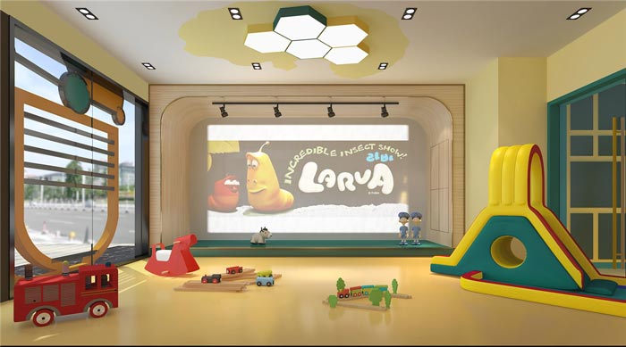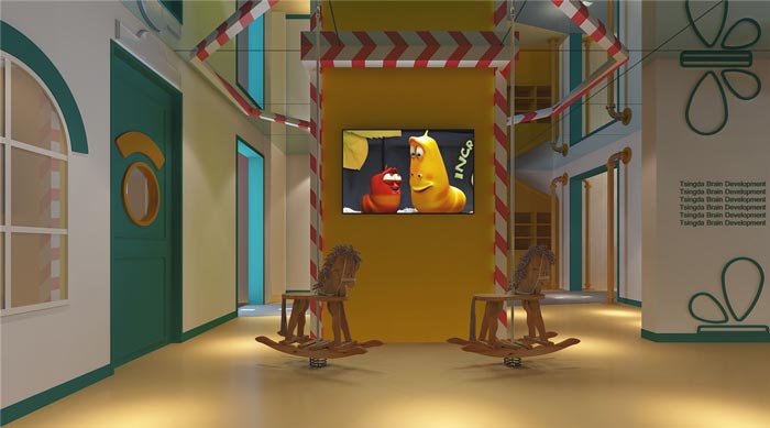 前臺(tái)區(qū)域的設(shè)計(jì):設(shè)計(jì)師在設(shè)計(jì)之初,搜索了很多關(guān)于早教中心的案例,進(jìn)行不斷的摸索與分析,同時(shí)一個(gè)歡快的空間氛圍也十分重要,其中爆笑蟲(chóng)子的出現(xiàn),也體現(xiàn)了設(shè)計(jì)師對(duì)于孩子的期待,爆笑蟲(chóng)子在設(shè)計(jì)師看來(lái)是一部充滿(mǎn)創(chuàng)意與樂(lè)趣的動(dòng)畫(huà),其中融合了音樂(lè)、節(jié)奏、豐富的肢體動(dòng)作,以此培養(yǎng)孩子們樂(lè)觀向上上、相互陪伴的人生價(jià)值觀。
