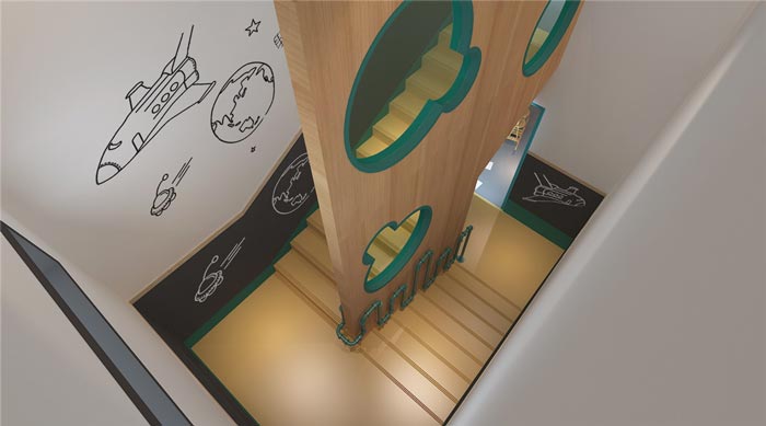 樓梯的設(shè)計(jì):此樓梯非彼樓梯,此處樓梯是按照孩子們的比例進(jìn)行改造的,孩子們可以輕松的上上下下,低于幼兒來(lái)說(shuō)也是一個(gè)不錯(cuò)的區(qū)域,孩子們通過(guò)不斷的努力不斷前行,最終走上二樓,這本身就是一種訓(xùn)練,對(duì)于設(shè)計(jì)師來(lái)說(shuō)整個(gè)空間都是一個(gè)挑戰(zhàn),讓孩子們不斷地成長(zhǎng)。